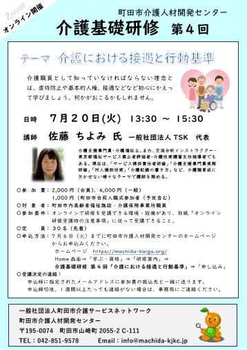 介護基礎研修 第4回 「介護における接遇と行動基準」オンライン講座 日 程 7月20日(火)13:30~15:30 会 場 オンライン(Zoom) 講 師 佐藤 ちよみ 氏・一般社団法人TSK 代表理事 内 容 「自分がされたい介護とはどのようなこと。自分がなりたい理想の介護職員ってどんな人」そんなこと、あんなことをグループで語り合いましょう。 対象者 町田市内高齢者福祉施設・介護保険事業所職員 https://machida-kaigo.org/eventDetail/detail/79