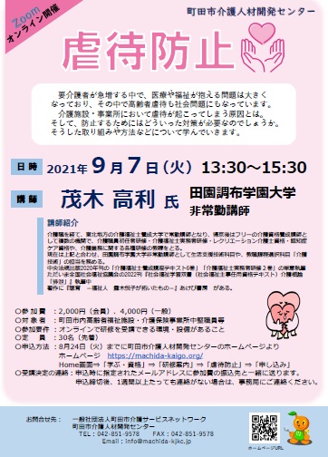 虐待防止 オンライン講座 2021年度介護報酬改定において、全ての介護サービス事業者を対象に、利用者の人権の擁護、虐待の防止等の観点から、虐待の発生又はその再発を防止するための委員会の開催、指針の整備、研修の実施、担当者を定めることが義務づけられました。 虐待防止には「教育、知識、介護技術」が重要になります。 この機会に「虐待防止」の研修にぜひご参加ください。 日 程 9月7日(火)13:30~15:30 会 場 オンライン(Zoom) 講 師 茂木 高利 氏 田園調布学園大学 非常勤講師