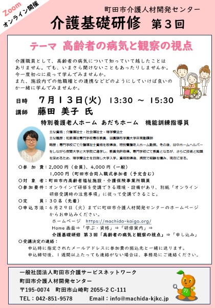 介護基礎研修 第3回 「高齢者の病気と観察の視点」オンライン講座 日 程 7月13日(火)13:30~15:30 会 場 オンライン(Zoom) 講 師 藤田 美子 氏 特別養護老人ホーム あだちホーム 機能訓練指導員 https://machida-kaigo.org/eventDetail/detail/78